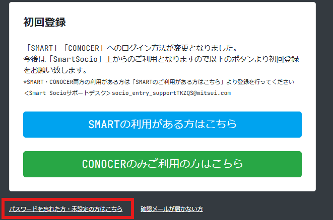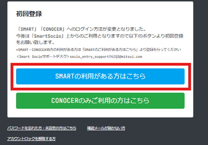 ログイン画面で「SMARTのご利用がある方はこちら」をクリックし、画面の案内に沿って初回登録を行ってください