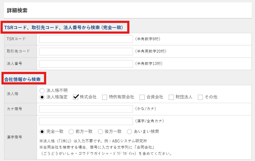2.調べたい企業の「TSRコード」や「企業名」等を入力