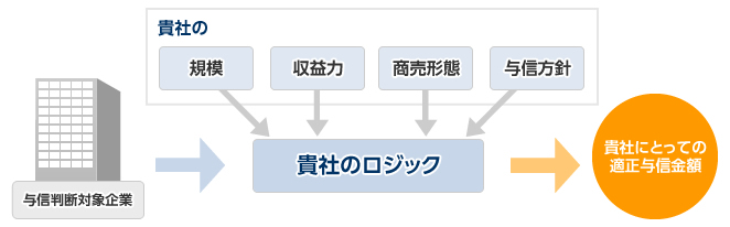 「適正与信ロジック」は、貴社の「規模」、「収益力」、「ご商売形態」、「与信方針」等を反映した与信限度額の算出ロジックです。