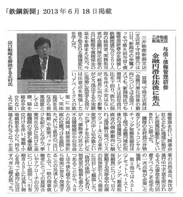2013年6月18日(火)付の日刊鉄鋼新聞に、当社常務取締役 北村 真の与信・債権管理研修の内容が掲載されました。